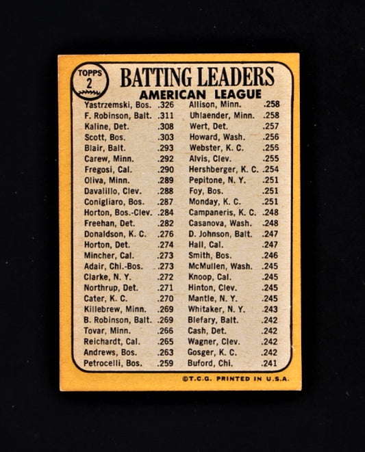 1968 Topps #2 AL Batting Leaders - Carl Yastrzemski / Frank Robinson / Al Kaline