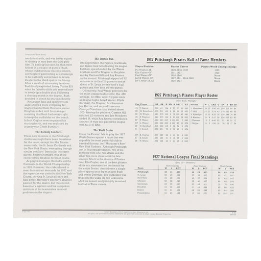 1927 Pirates Cooperstown Collections Statistics Commemorative 9x12 Stat Card With Cloth Uniform Patch